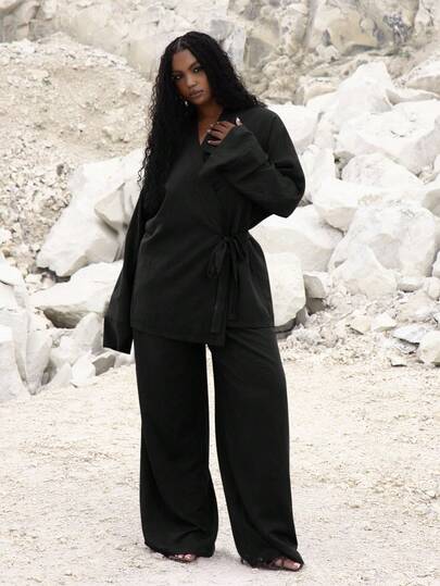 MUSERA 加厚弹力阔腿裤,可爱夏日假日优雅度假风,性感场合,曲线迷人 - 黑色 - 查看 2