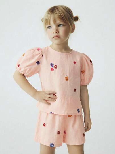 Maija Kids 两件套少女优雅都市学院风花卉刺绣圆领宽松泡泡袖上衣和短裤套装,适合返校、日常休闲穿着、外出、聚会、节日、春夏季节等场合。