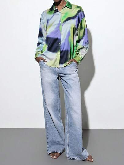 Maija 女士时尚百搭扎染印花缎面单排扣翻领长袖衬衫,春季 - 彩色 - 查看 1