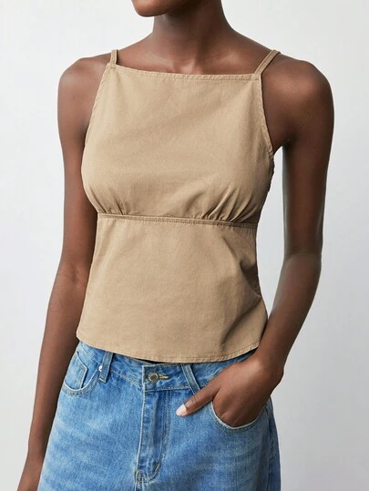 Maija 女式卡其色无袖吊带设计性感露背牛仔上衣 - 棕色 - 查看 1