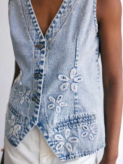 Maija 女式夏季水洗花卉图案前扣蓝色牛仔背心 - 淺色水洗藍 - 查看 6
