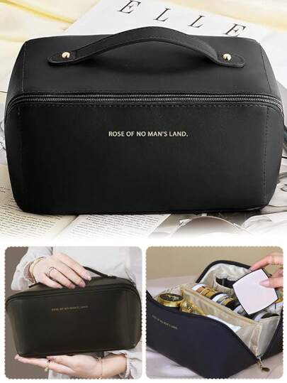 化妝包女性便攜式旅行防水收納手提袋pu皮革化妝包組織器美容包手提包化妝袋pu皮革 - 黑色 - 查看 1