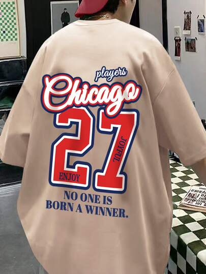 Manfinity Campus Court 男士字母圖案落肩T恤 - 杏色 - 查看 4