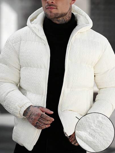 Manfinity CasualCool 男士秋冬针织提花连帽绗缝长袖羽绒服,宽松休闲舒适,男友礼物,街头风 - 白色 - 查看 1
