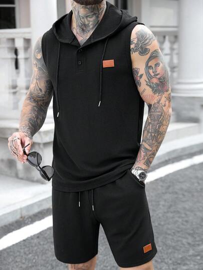 Manfinity CasualCool 男士抽绳连帽卫衣和抽绳腰短裤休闲日常套装 - 黑色 - 查看 1