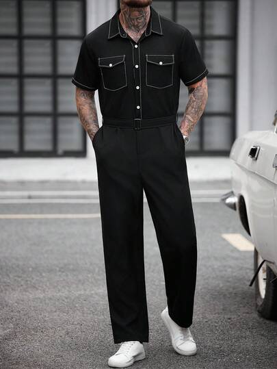 Manfinity CasualCool 男士翻盖口袋抽绳腰带衬衫连体裤 男士连体裤 男士S码连体裤 男士S码连体裤 男士连体裤 ... - 黑色 - 查看 1