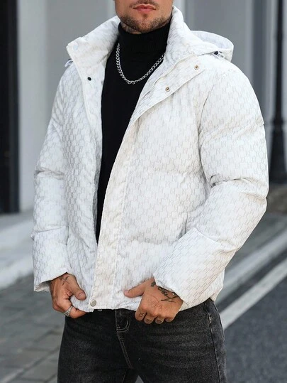 Manfinity CasualCool 男士长袖全印花连帽短款羽绒服,保暖冬季白色拉链外套,秋季 - 白色 - 查看 1