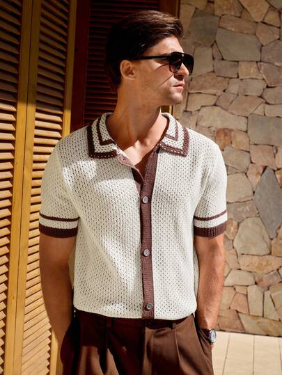 Manfinity CityGents 男士休闲撞色滚边短袖针织上衣,夏季 - 杏色 - 查看 1