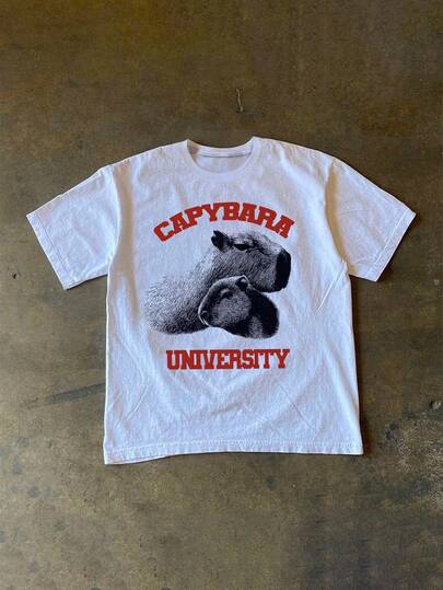 Manfinity Dauomo 休闲街头风男士圆领T恤,水田鼠动物图案系列 - 白色 - 查看 1