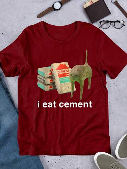 Manfinity Dauomo 我吃水泥趣味猫咪表情包猫脸图案短袖 T 恤,男士标准尺码 - 酒紅色 - 查看 4