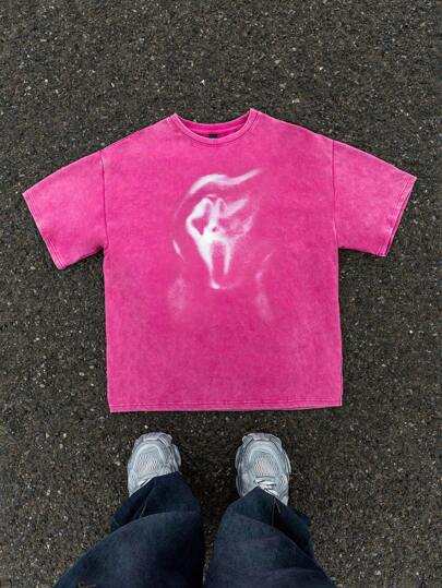 Manfinity ZONE917 寬鬆落肩雪花油炸T卹,淺粉色 - 玫紅色 - 查看 1