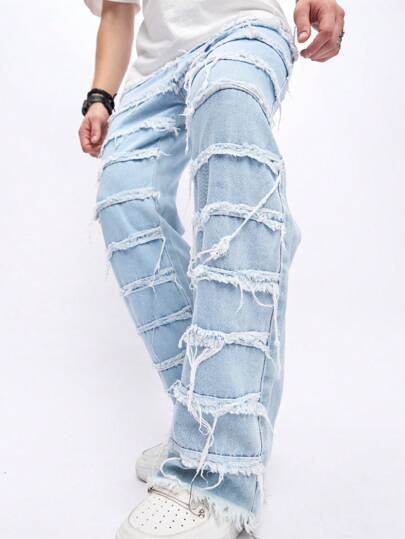 Manfinity Roghcode 宽松男式毛边直筒牛仔裤 - 藍色 - 查看 4