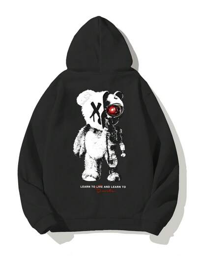 Manfinity Roghcode 男士熊和標語圖案袋鼠口袋抽繩連帽衫 - 黑色 - 查看 1