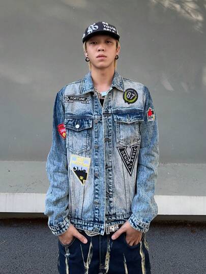 Manfinity Roghcode 男士字母補丁細節翻蓋口袋牛仔夾克 - 淺色水洗藍 - 查看 1
