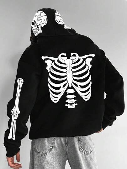 Manfinity EMRG 男士骷髏印花下垂肩帶鬆緊帶寬鬆連帽衫 - 黑色 - 查看 1