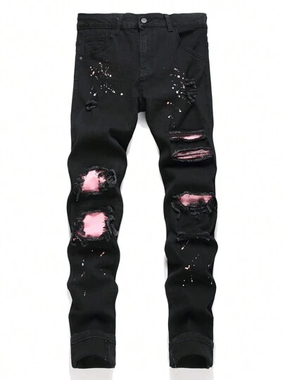 Manfinity Roughcore 男士纽扣前口袋破洞牛仔裤,日常休闲装,emo 风格 - 黑色 - 查看 1