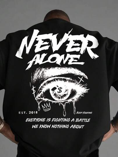 Manfinity EMRG 男士标语与眼睛图案圆领宽松休闲短袖 T 恤 - 黑色 - 查看 1