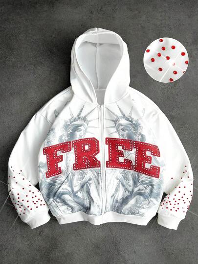 Manfinity EMRG 男士街头风INS风自由女神像“FREE”红色水钻装饰休闲保暖连帽衫,男友/老公礼物,周年纪念礼物,白色拉链连帽衫,红色水钻设计,水钻连帽衫,秋冬款 - 白色 - 查看 1