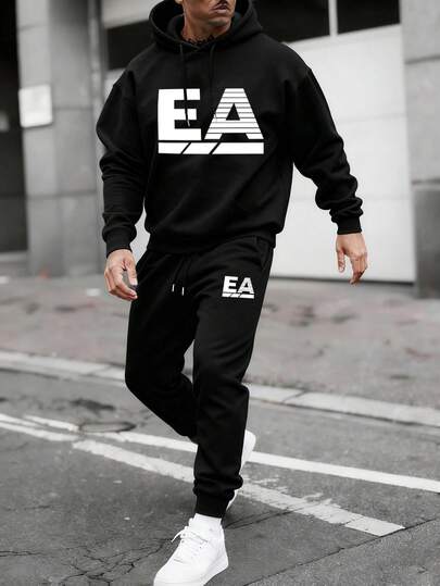Manfinity Homme 男士落肩长袖抽绳连帽宽松卫衣两件套,圣诞礼物,男士两件套,新年套装,男装,男士礼物,男士慢跑套装,男士连帽衫和运动裤套装,男士运动服套装,男士两件套