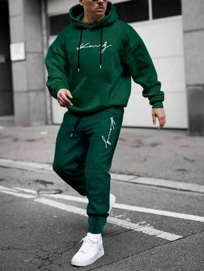 Manfinity Homme 男士字母圖案抽繩連帽衫和運動褲 - 綠色 - 查看 1