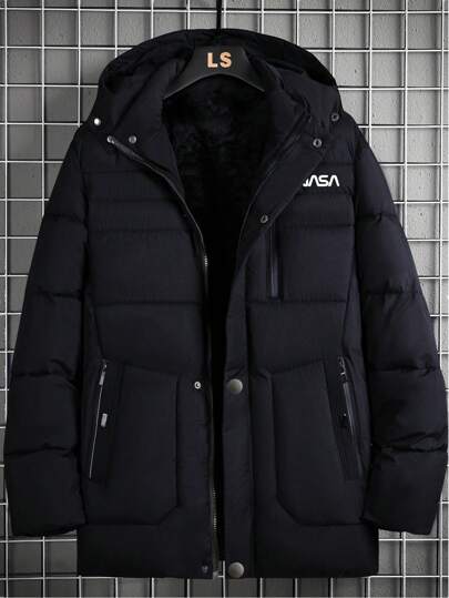 Manfinity Homme 男士长袖字母图案拉链连帽羽绒服,秋冬款 - 黑色 - 查看 6