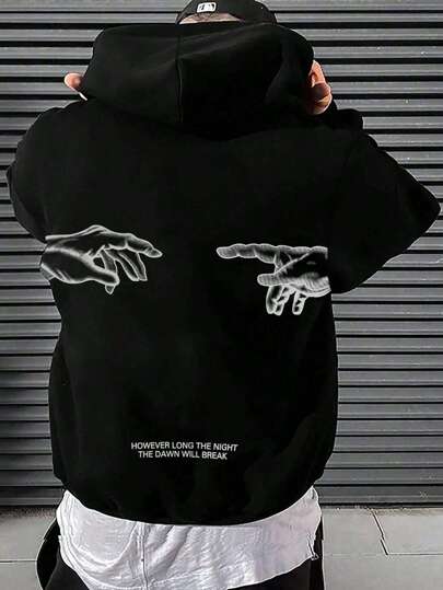 Manfinity Homme 男士大码手和標語圖案抽繩連帽衫 - 黑色 - 查看 1