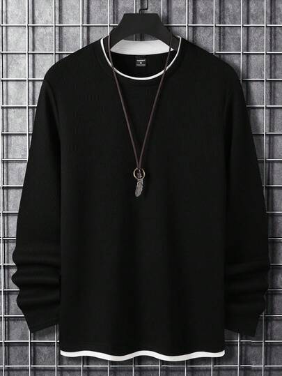 Manfinity Homme 男士纯色华夫格针织二合一 T 恤,男士长袖上衣,秋季 - 黑色 - 查看 1