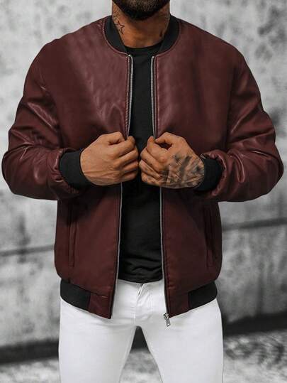 Manfinity Homme 男士拉鏈開襟飛行員夾克 - 酒紅色 - 查看 1