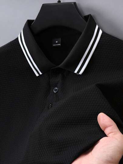 Manfinity Homme 男士休闲/办公百搭撞色条纹短袖Polo衫,夏季款 - 黑色 - 查看 1