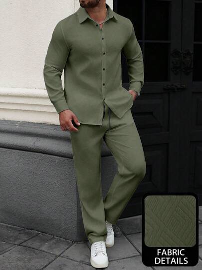 Manfinity Homme 男士休闲纹理纽扣长袖衬衫和长裤套装