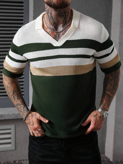 Manfinity Homme 男式撞色条纹短袖针织上衣 - 彩色 - 查看 1