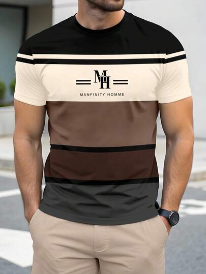 Manfinity Homme 男士字母条纹印花圆领短袖休闲T恤 - 彩色 - 查看 1