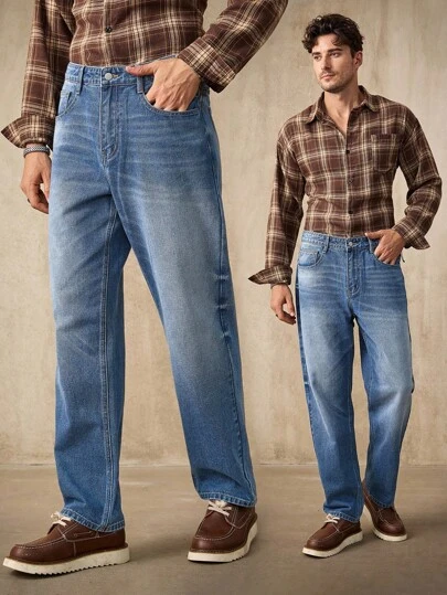 Manfinity Homme 男士中蓝色宽松直筒牛仔裤 - 中等水洗藍 - 查看 1