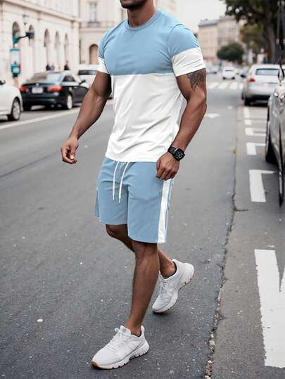 Manfinity Homme 男士短袖圆领拼色 T 恤和短裤套装 - 彩色 - 查看 1