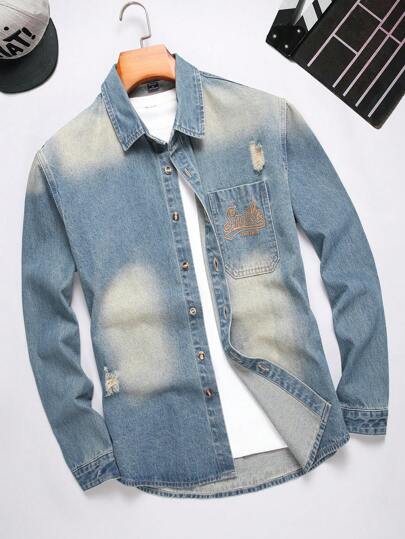 Manfinity Homme 男士日常簡約印花牛仔襯衫 - 中等水洗藍 - 查看 1