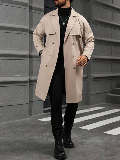 Manfinity Homme 男士街头热销INS风男士纽扣前襟长袖口袋简约休闲风衣,外出法兰绒风衣,适合送给朋友、丈夫、男友的礼物,男士长款外套,男士米色外套,男士风衣,秋季新款 - 卡其色 - 查看 2