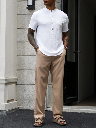 Manfinity Homme 男士夏季休闲短袖衬衫和裤子套装白色亨利衫男士夏季衬衫 - 白色 - 查看 1