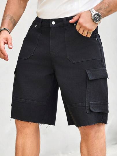 Manfinity Homme 男士实用口袋阔腿百慕大休闲牛仔短裤 - 黑色 - 查看 1