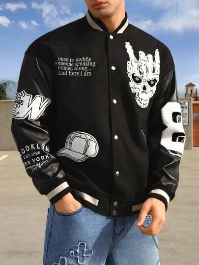 Manfinity LEGND 男士字母與骷髏印花條紋彈力邊條夾克 - 黑色 - 查看 1