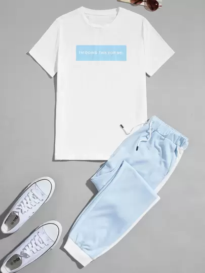 Manfinity Hypemode 男士標語圖案T恤和腰部抽繩運動褲 - 藍白色 - 查看 1