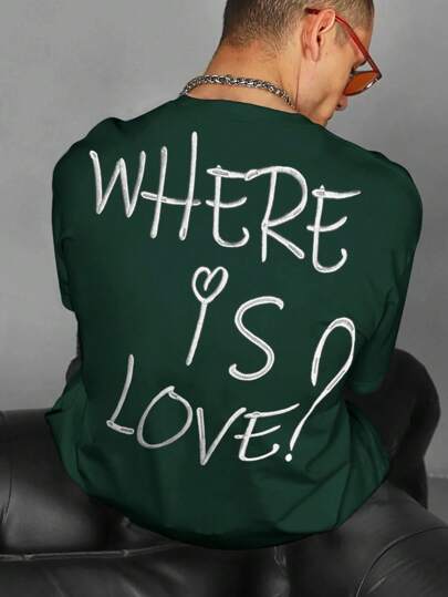 Manfinity Hypemode 男士休闲标语刺绣短袖 T 恤,春夏 - 墨綠色 - 查看 1