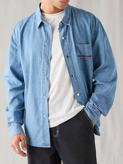 Manfinity Hypemode 男士浅色洗水牛仔宽松休闲衬衫,Urbanchill - 淺色水洗藍 - 查看 6
