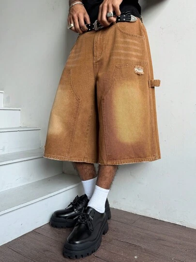 Manfinity Hypemode 男女通用卡其色复古做旧水洗牛仔七分裤 - 卡其色 - 查看 5