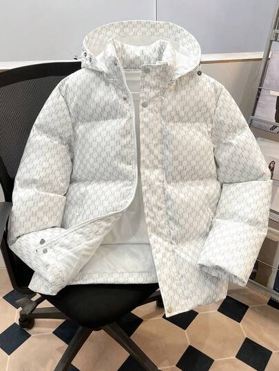 Manfinity Joysei 男士全印花连帽短款夹棉大衣,冬季保暖白色拉链大衣,秋季 - 白色 - 查看 7