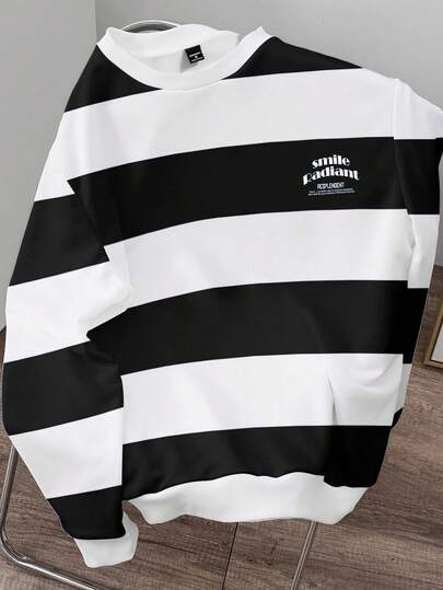 Manfinity Joysei 男士休闲标语条纹圆领长袖宽松套头衫,秋冬 - 彩色 - 查看 1