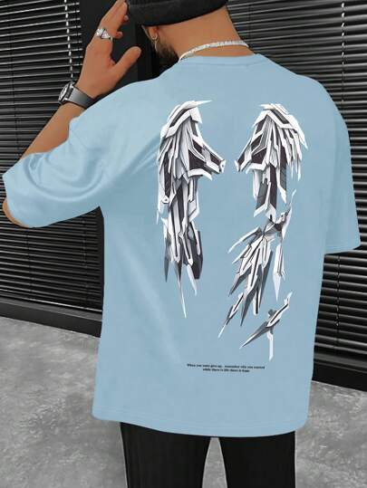 Manfinity LEGND 男士翅膀&標語圖案落肩T恤 - 藍色 - 查看 1