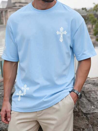 Manfinity LEGND 男士休闲十字印花短袖T恤,夏季 - 淺藍色 - 查看 1