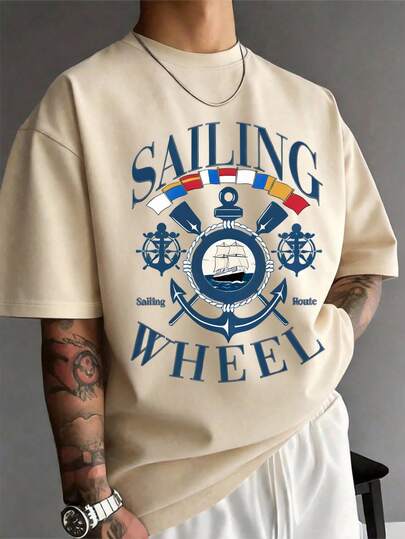 Manfinity LEGND 男士白色圆领短袖T恤,意大利元素印花,针织款式 - 卡其色 - 查看 1