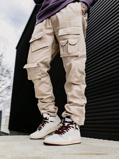Manfinity 男士寬鬆戰術褲,帶有翻蓋口袋和側邊口袋 - 米色 - 查看 1