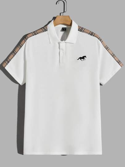 GENTILAND 男士馬印花拼接格紋側接縫POLO衫 - 白色 - 查看 1